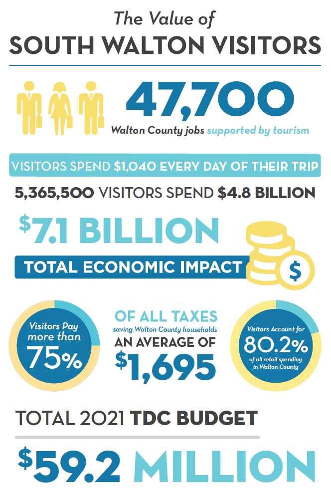 Ultimately, almost 5.4 million visitors made their way to South Walton in 2021, spending more than $4.85 billion. This included more than 80% of all retail spending in Walton County.